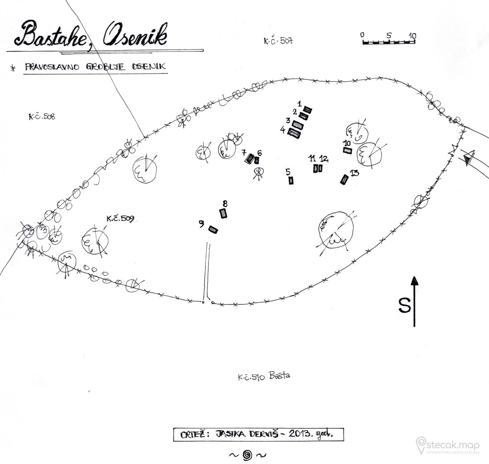 Interesantno je da opisi ukrasa, a naročito njihovih oštećenja, koje Vukasović opisuje prije više od 130 godina, u potpunosti odgovaraju stanju koje se i danas može uočiti na licu mjesta. Arheološki leksikon BiH ovdje bilježi svega 6 stećaka, dok teško uočljive tragove natpisa raniji autori nisu spominjali.