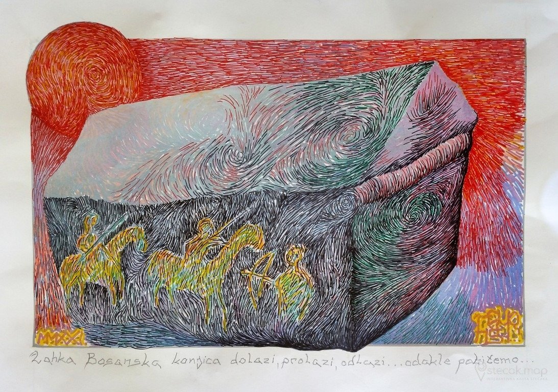 Ukrašena su čak četiri primjerka. Najimpozantniji je teško uočljiv reljef (2012.) na stećku br. 2, koji je prije 125 godina detaljno opisao Vid Vuletić Vukasović. Na monumentalnom sljemenjaku, sa južne bočne strane u vrlo plitkom reljefu, uklesan je motiv dvaju konjanika. Jedan konjanik drži koplje sa zastavom. Ispred konjanika je ljudska figura sa lukom i strijelom. Motiv asocira na scenu ratnika. S obje čeone strane uklesan je motiv tordirane vrpce (užeta). Na stećku br. 3 je teško uočljiva i jako neuvjerljiva rozeta (ruža). Ovaj je ukras danas veoma upitan. Ukras bilježi Vuletić: U vrhu mu je ruža, al se jedva pozna. Stećak br. 4 je veoma elegantno i fino klesan monumentalni sljemenjak. Ivice su mu obrađene u obliku istaknutog polukružnog brida. Vuletić spominje i postolje koje je također ukrašeno. Za provjeru ovog postolja bilo bi neophodno dodatno iskopavanje. Na vrhu stećka bile su tri jabuke, a do danas se sačuvala samo jedna. Stećak br. 6 je s obje čeone strane ukrašen dvostrukim spiralama.