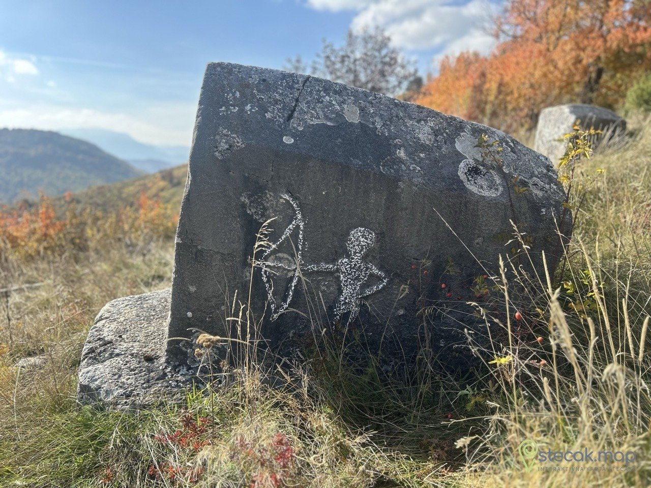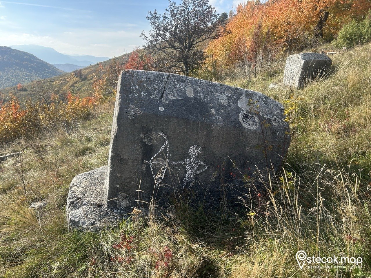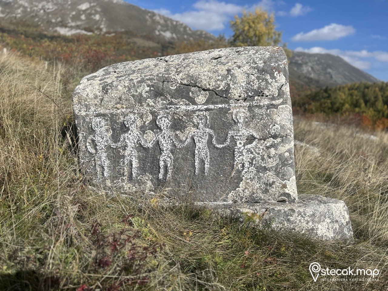 Na istočnoj strani nekropole je ukrašeno šest stećaka: tri sanduka sa postoljem i tri sljemenjaka sa postoljem. Ukrasni motivi su polumjesec, pravougaonik, polujabuke, krug, luk i strijela. Sa desne strane od ulaza u ograđenu nekropolu, nalazi se veći sljemenjak sa postoljem na kojem je prikazana scena lova na istočnoj bočnoj strani. Na većem sljemenjaku sa postoljem, gotovo na samom kraju nekropole, na sjevernoj bočnoj strani je prikaz muškarca sa lukom i strijelom, dok je na južnoj bočnoj strani scena muškog kola. Uočen je novi motiv, odnosno ukrašen stećak na zapadnoj strani nekropole. Riječ je o prevrnutom sanduku ili sljemenjaku sa postoljem, koji je prelomljen na dva dijela, a na vidljivoj bočnoj strani se nalazi motiv križa.