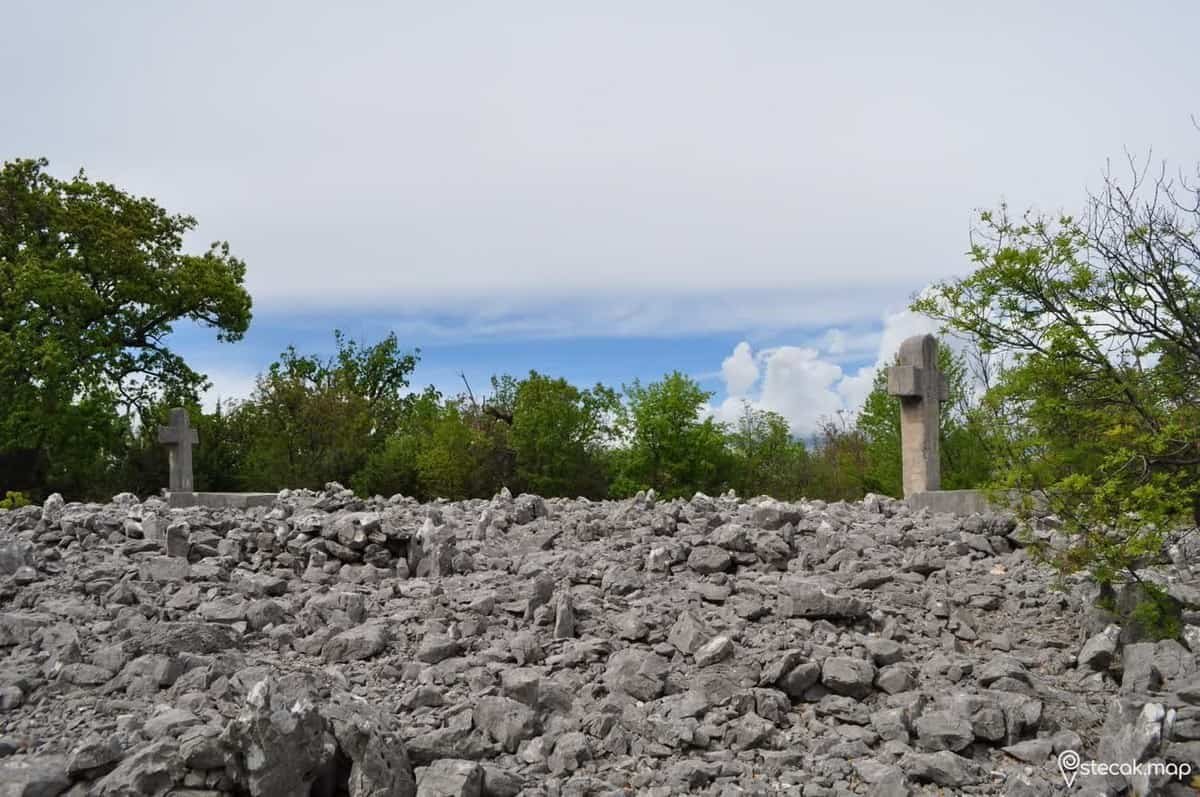 U blizini pravoslavno groblje s brojnim krstačama ukrašenim rozetama. Stećci su smješteni na kamenom tumulusu.