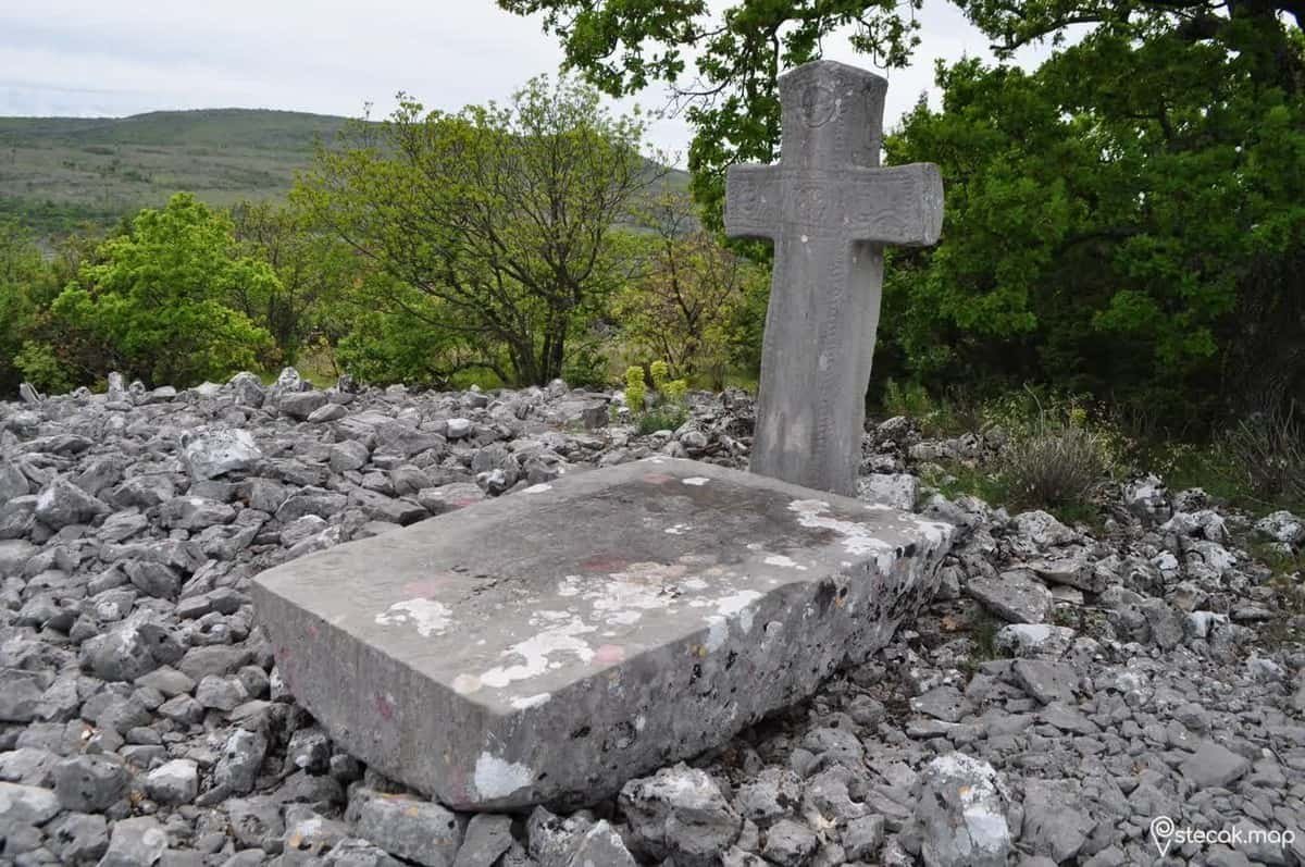 U blizini pravoslavno groblje s brojnim krstačama ukrašenim rozetama. Stećci su smješteni na kamenom tumulusu.
