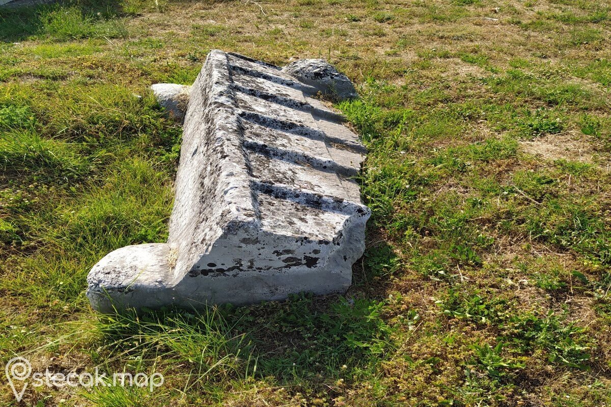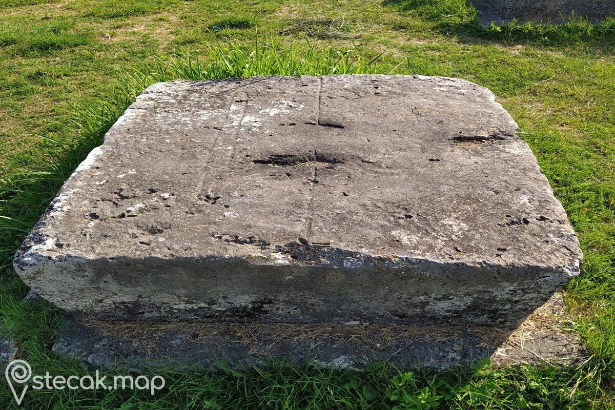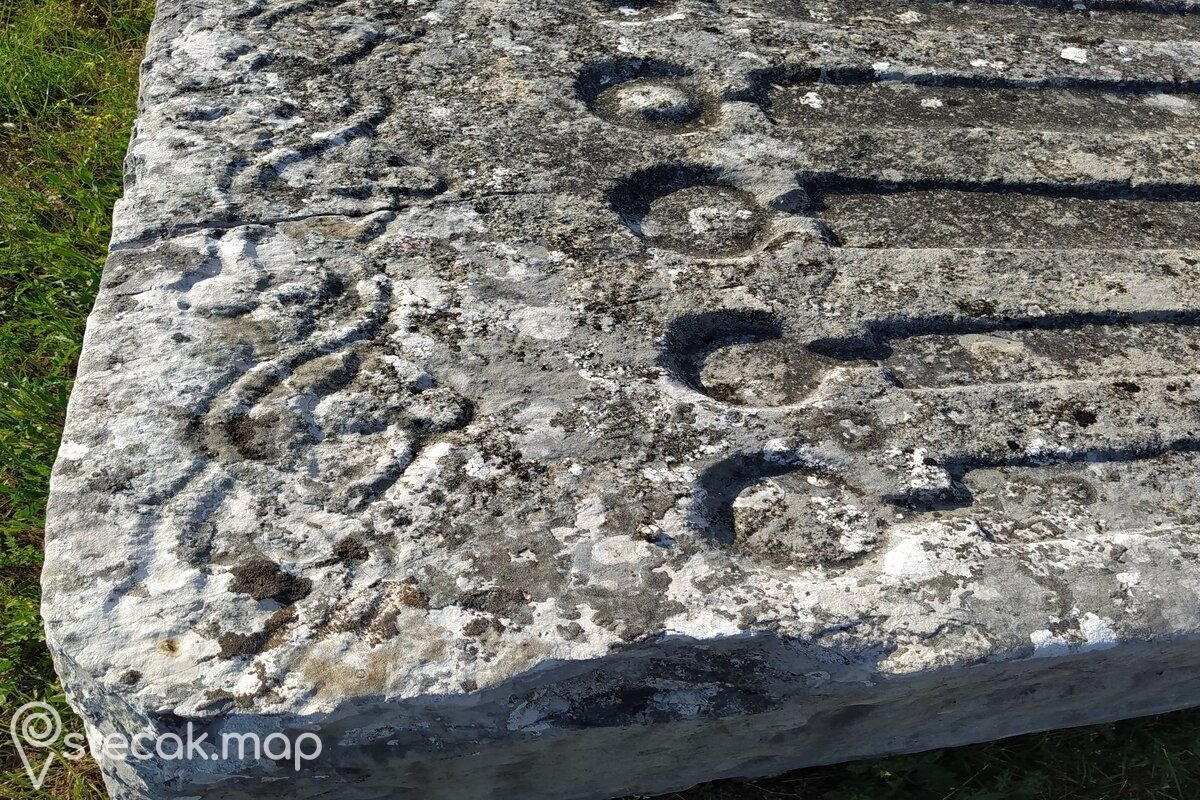 Prevrnuti visoki sanduk ukrašen je motivima potkovičastih arkada (tri vidljive strane), povijene lozice s trolistom (obrub) i motivom štita ispod kojega je položen mač (bočna sjeverna strana). Gornja ploha niskog sanduka s postoljem koji se nalazi na južnoj strani groblja podijeljen je linijom na dvije plohe. Na lijevoj polovici je udubljenje, a na desnoj motiv mača.
