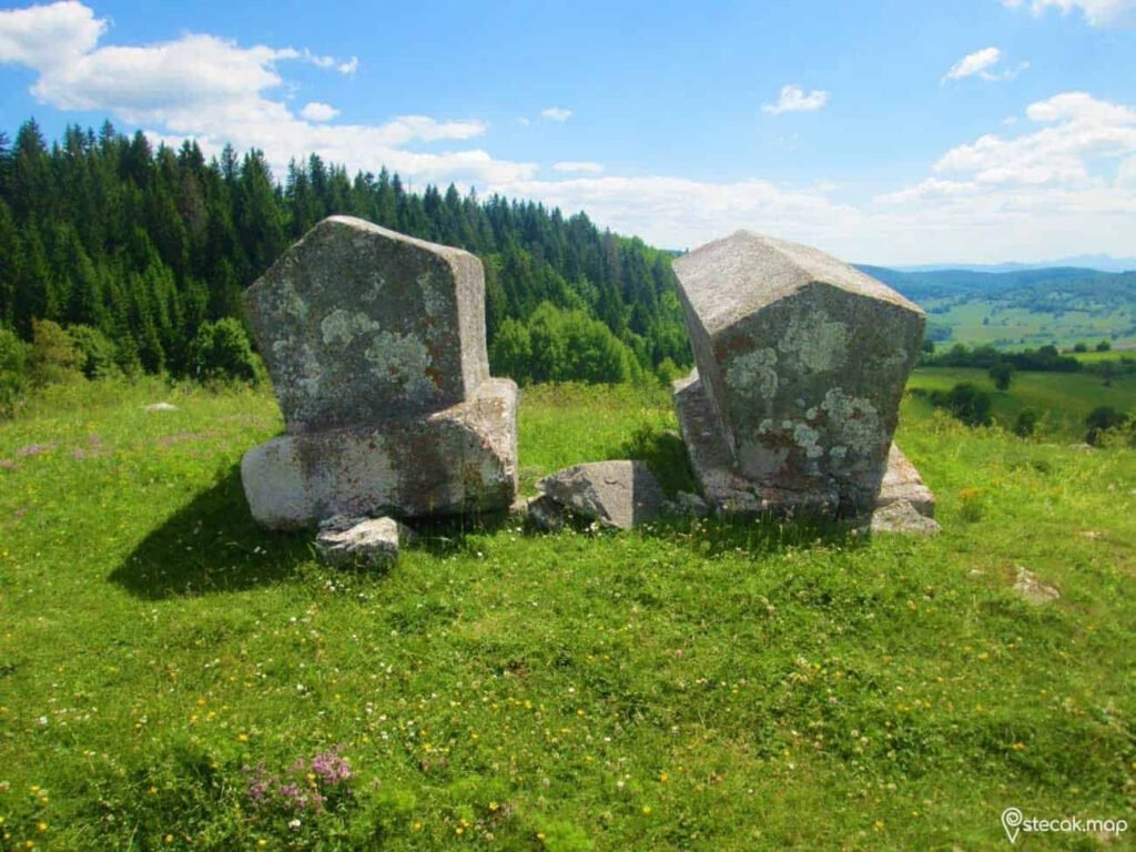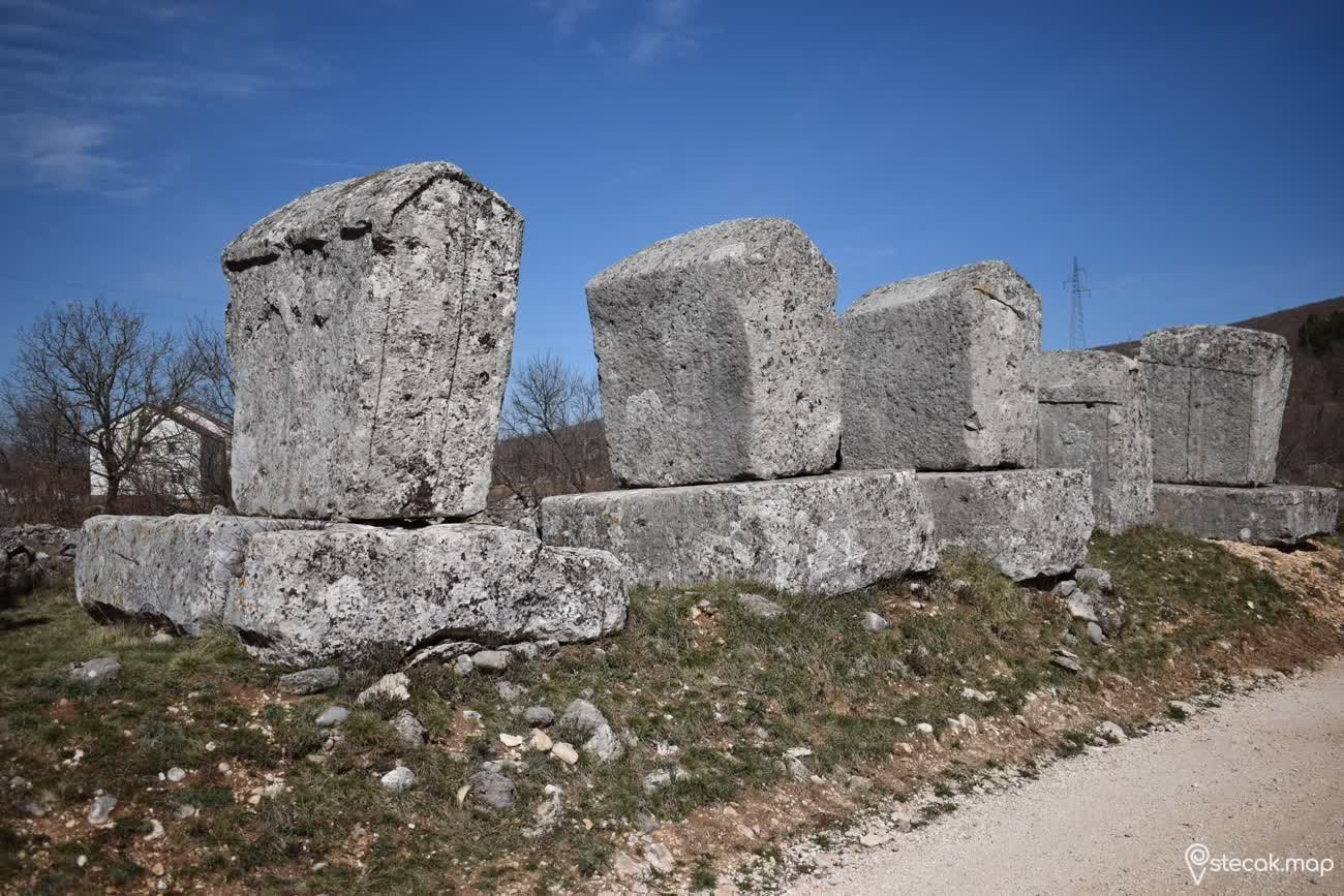 S desne strane potoka nalaze se dvije skupine, prva je odmah uz makadamski put te broji 7 primjeraka koji se ističu svojom monumentalnošću i ukrasima, dok se na glavici nalaze 3 stećka.