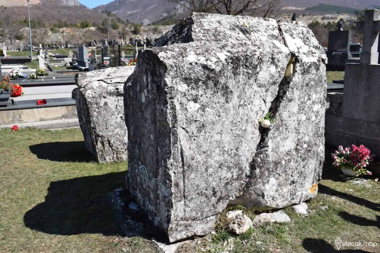 Dva najznačajnija i najočuvanija nalaze se u sredini groblja. Po obliku su dva sljemenjaka, od kojih je jedan s postoljem. Ovi sljemenjaci imaju karakteristični krovni dio koji podsjeća na kuću.